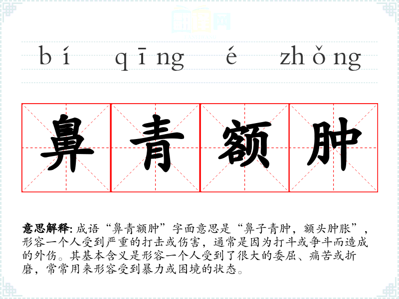成语“鼻青额肿”字面意思是“鼻子青肿,额头肿胀”,形容一个人受到严重的打击或伤害,通常是因为打斗或争斗而造成的外伤。其基本含义是形容一个人受到了很大的委屈、痛苦或折磨,常常用来形容受到暴力或困境的状态。