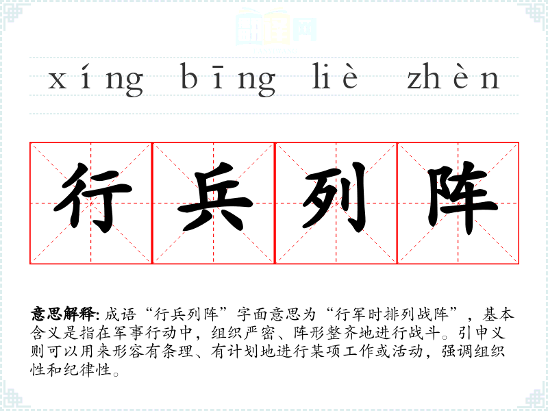 成语“行兵列阵”字面意思为“行军时排列战阵”,基本含义是指在军事行动中,组织严密、阵形整齐地进行战斗。引申义则可以用来形容有条理、有计划地进行某项工作或活动,强调组织性和纪律性。