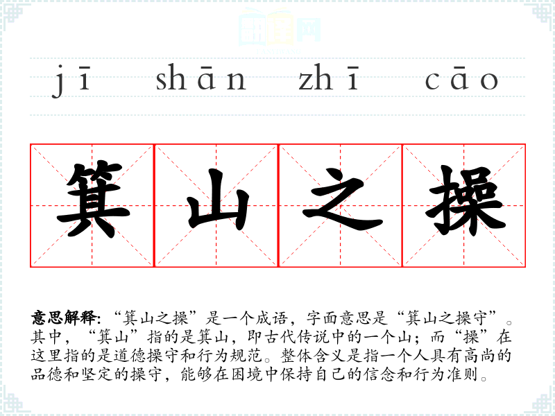 “箕山之操”是一个成语,字面意思是“箕山之操守”。其中,“箕山”指的是箕山,即古代传说中的一个山;而“操”在这里指的是道德操守和行为规范。整体含义是指一个人具有高尚的品德和坚定的操守,能够在困境中保持自己的信念和行为准则。