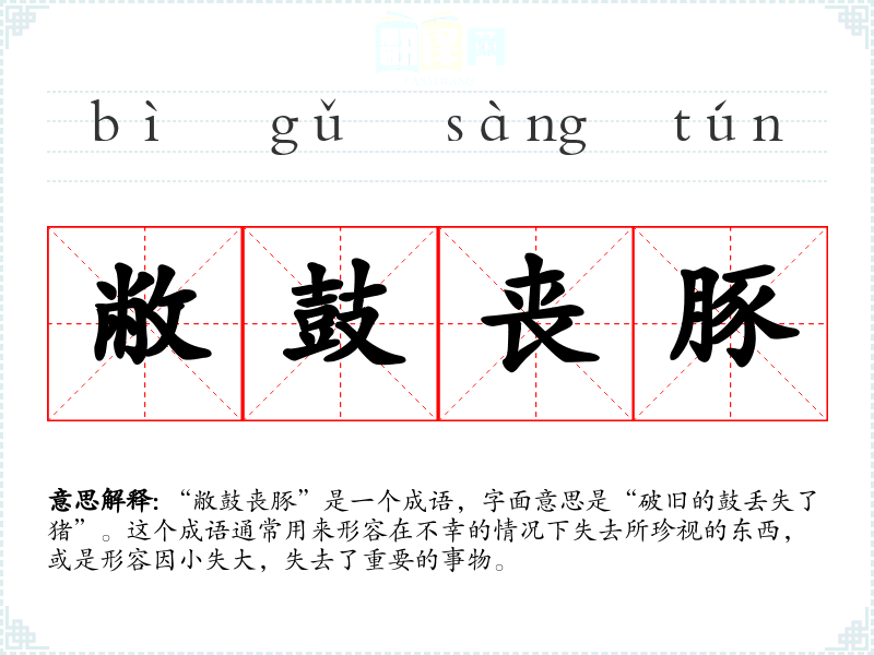 “敝鼓丧豚”是一个成语,字面意思是“破旧的鼓丢失了猪”。这个成语通常用来形容在不幸的情况下失去所珍视的东西,或是形容因小失大,失去了重要的事物。