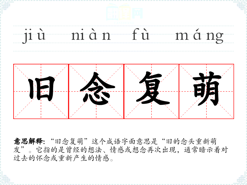 “旧念复萌”并没有明确的历史典故或文学出处,属于一种常见的表达方式,反映了人们在经历时间的推移后,对过去情感的再度感知。成语中的“旧念”代表着过去的情感或想法,而“复萌”则表示再次出现或重新生长。