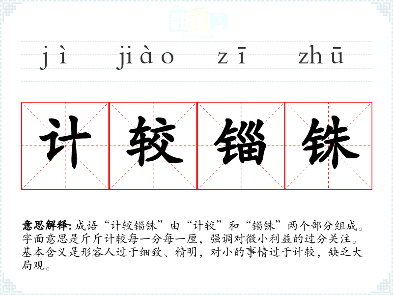 成语“计较锱铢”由“计较”和“锱铢”两个部分组成。字面意思是斤斤计较每一分每一厘,强调对微小利益的过分关注。基本含义是形容人过于细致、精明,对小的事情过于计较,缺乏大局观。