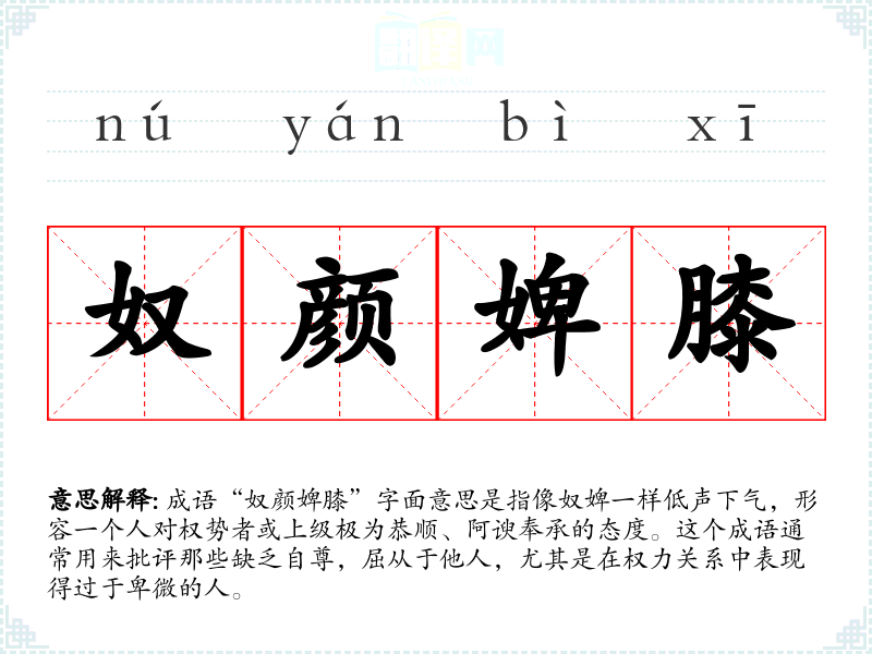 成语“奴颜婢膝”字面意思是指像奴婢一样低声下气,形容一个人对权势者或上级极为恭顺、阿谀奉承的态度。这个成语通常用来批评那些缺乏自尊,屈从于他人,尤其是在权力关系中表现得过于卑微的人。
