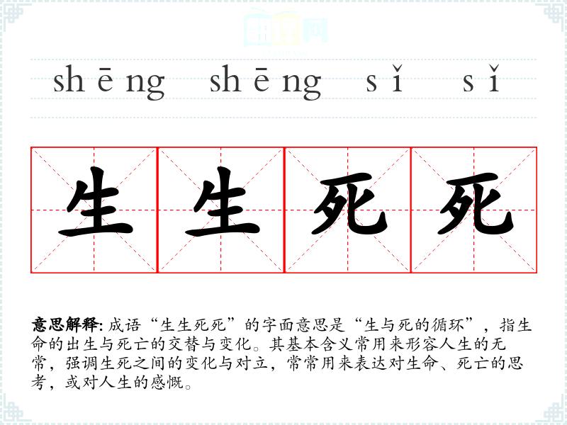 成语“生生死死”的字面意思是“生与死的循环”,指生命的出生与死亡的交替与变化。其基本含义常用来形容人生的无常,强调生死之间的变化与对立,常常用来表达对生命、死亡的思考,或对人生的感慨。