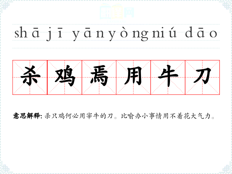 | 割鸡焉用牛刀 | 杀只鸡何必用宰牛的刀。比喻办小事情用不着花大气力。 |