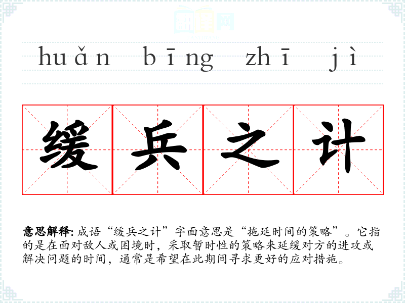 成语“缓兵之计”字面意思是“拖延时间的策略”。它指的是在面对敌人或困境时,采取暂时性的策略来延缓对方的进攻或解决问题的时间,通常是希望在此期间寻求更好的应对措施。
