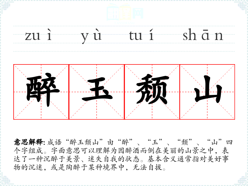 成语“醉玉颓山”由“醉”、“玉”、“颓”、“山”四个字组成。字面意思可以理解为因醉酒而倒在美丽的山景之中,表达了一种沉醉于美景、迷失自我的状态。基本含义通常指对美好事物的沉迷,或是陶醉于某种境界中,无法自拔。