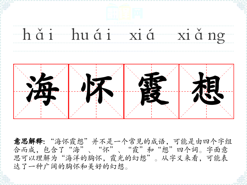由于“海怀霞想”不属于传统成语,它可能是现代文学或诗歌中的创造性表达。具体历史背景或文学出处尚不明确,但可以想象它可能出现在描述自然美景、抒发情感的作品中。