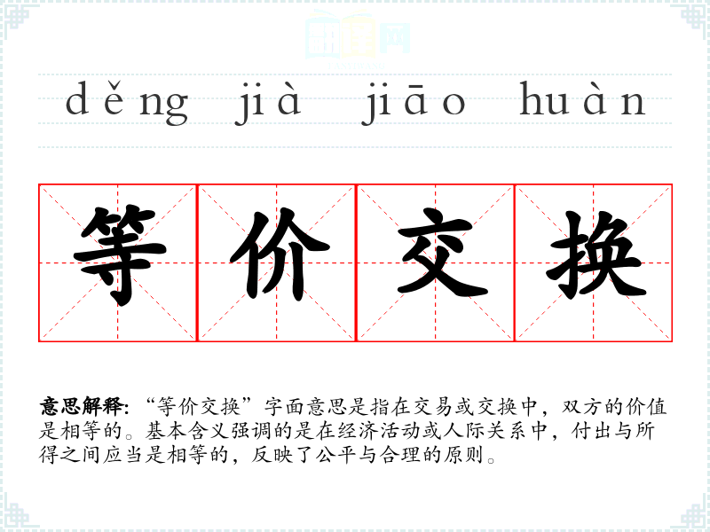 “等价交换”字面意思是指在交易或交换中,双方的价值是相等的。基本含义强调的是在经济活动或人际关系中,付出与所得之间应当是相等的,反映了公平与合理的原则。