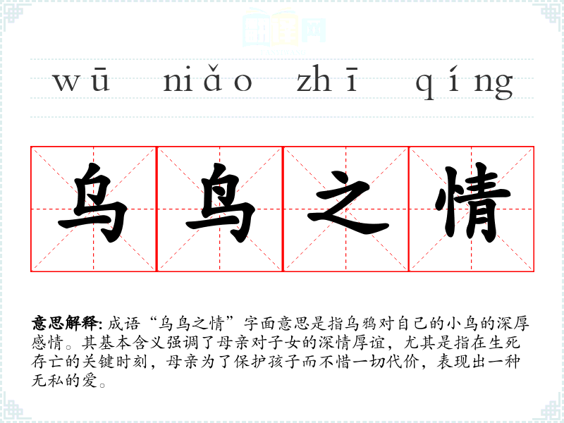 成语“乌鸟之情”字面意思是指乌鸦对自己的**的深厚感情。其基本含义强调了母亲对子女的深情厚谊,尤其是指在生死存亡的关键时刻,母亲为了保护孩子而不惜一切代价,表现出一种无私的爱。