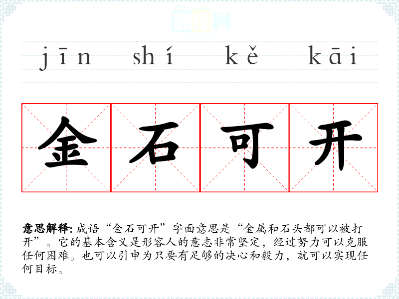 成语“金石可开”字面意思是“金属和石头都可以被打开”。它的基本含义是形容人的意志非常坚定,经过努力可以克服任何困难。也可以引申为只要有足够的决心和毅力,就可以实现任何目标。