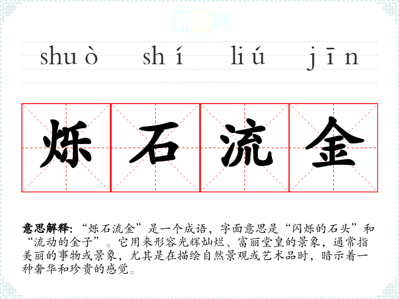 “烁石流金”是一个成语,字面意思是“闪烁的石头”和“流动的金子”。它用来形容光辉灿烂、富丽堂皇的景象,通常指美丽的事物或景象,尤其是在描绘自然景观或艺术品时,暗示着一种奢华和珍贵的感觉。