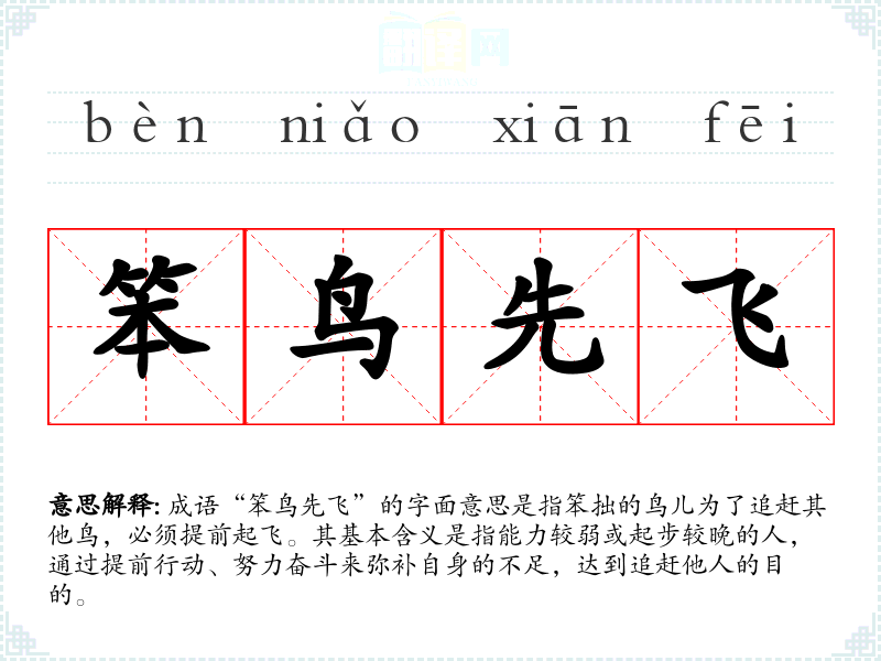成语“笨鸟先飞”的字面意思是指笨拙的鸟儿为了追赶其他鸟,必须提前起飞。其基本含义是指能力较弱或起步较晚的人,通过提前行动、努力奋斗来弥补自身的不足,达到追赶他人的目的。
