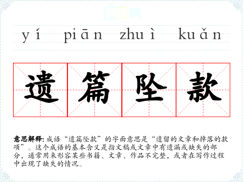 成语“遗篇坠款”的字面意思是“遗留的文章和掉落的款项”。这个成语的基本含义是指文稿或文章中有遗漏或缺失的部分,通常用来形容某些书籍、文章、作品不完整,或者在写作过程中出现了缺失的情况。