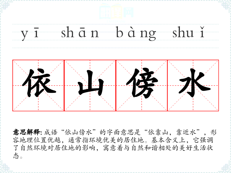 | 依山傍水 | 指地理位置靠近山岭和水流。 |