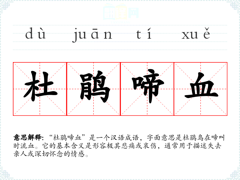 在**传统文化中,杜鹃鸟被视为悲伤的象征,尤其在古代诗词中频繁出现。因此,“杜鹃啼血”不仅反映了个人的情感,也反映了社会对生死、离别的普遍态度。在现代社会,这个成语依然适用,尤其在表达对逝者的怀念时,能引起强烈的共鸣。