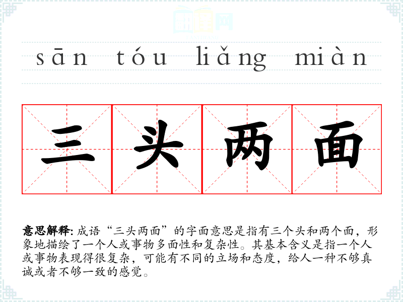 成语“三头两面”的字面意思是指有三个头和两个面,形象地描绘了一个人或事物多面性和复杂性。其基本含义是指一个人或事物表现得很复杂,可能有不同的立场和态度,给人一种不够真诚或者不够一致的感觉。