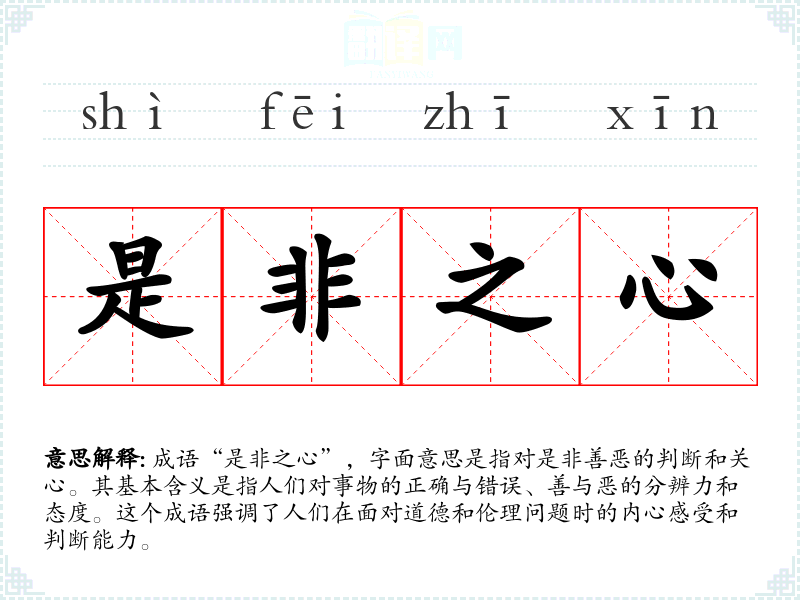 成语“是非之心”,字面意思是指对是非善恶的判断和关心。其基本含义是指人们对事物的正确与错误、善与恶的分辨力和态度。这个成语强调了人们在面对道德和伦理问题时的内心感受和判断能力。