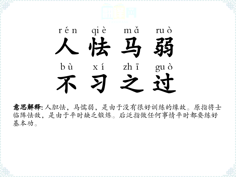 人胆怯,马懦弱,是由于没有很好训练的缘故。原指将士临阵怯敌,是由于平时缺乏锻炼。后泛指做任何事情平时都要练好基本功。 |