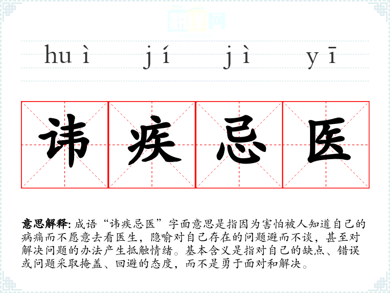 | 讳疾忌医 | 讳:避忌;忌:怕,畏惧。隐瞒疾病,不愿医治。比喻怕人批评而掩饰自己的的缺点和错误。 |