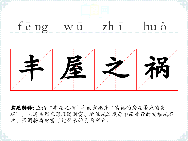 成语“丰屋之祸”字面意思是“富裕的房屋带来的灾祸”。它通常用来形容因财富、地位或过度奢华而导致的灾难或不幸,强调物质财富可能带来的负面影响。