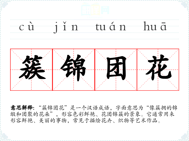 | 花攒绮簇 | 锦:有彩色花纹的丝织品;簇:聚成一团。形容五彩缤纷的景象。 |