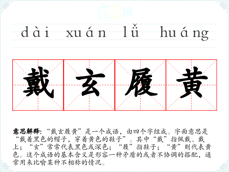 “戴玄履黄”是一个成语,由四个字组成。字面意思是“戴着黑色的帽子,穿着黄色的鞋子”。其中“戴”指佩戴、戴上;“玄”常常代表黑色或深色;“履”指鞋子;“黄”则代表黄色。这个成语的基本含义是形容一种矛盾的或者不协调的搭配,通常用来比喻某种不相称的情况。