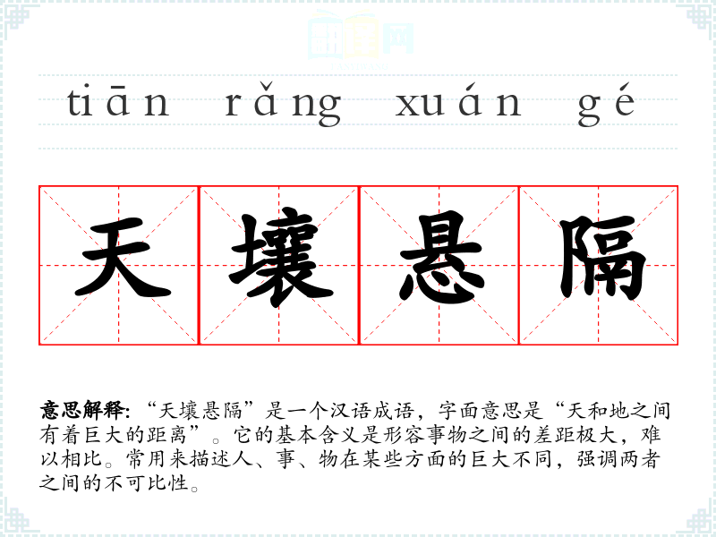 “天壤悬隔”是一个汉语成语,字面意思是“天和地之间有着巨大的距离”。它的基本含义是形容事物之间的差距极大,难以相比。常用来描述人、事、物在某些方面的巨大不同,强调两者之间的不可比性。