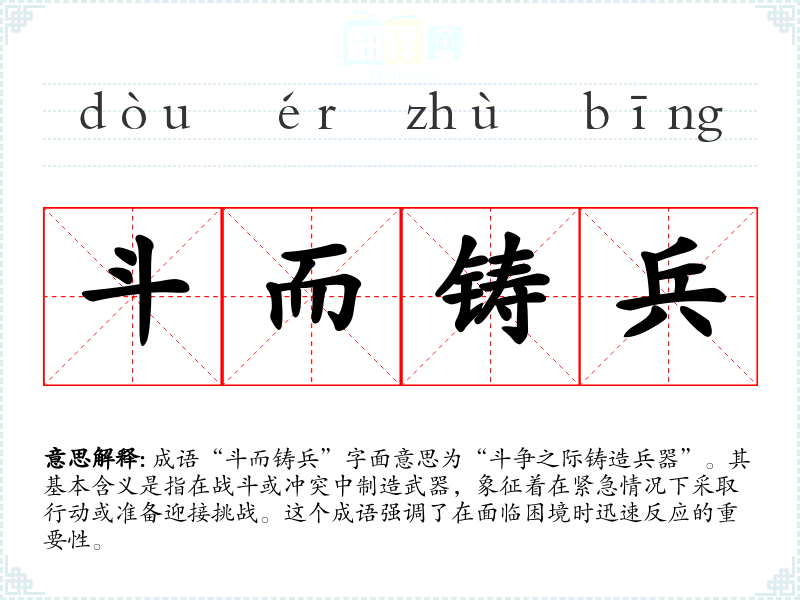 成语“斗而铸兵”字面意思为“斗争之际铸造兵器”。其基本含义是指在战斗或冲突中制造武器,象征着在紧急情况下采取行动或准备迎接挑战。这个成语强调了在面临困境时迅速反应的重要性。