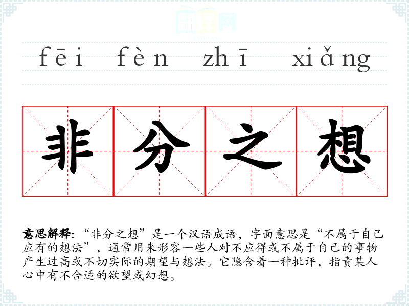 “非分之想”是一个汉语成语,字面意思是“不属于自己应有的想法”,通常用来形容一些人对不应得或不属于自己的事物产生过高或不切实际的期望与想法。它隐含着一种批评,指责某人心中有不合适的欲望或幻想。
