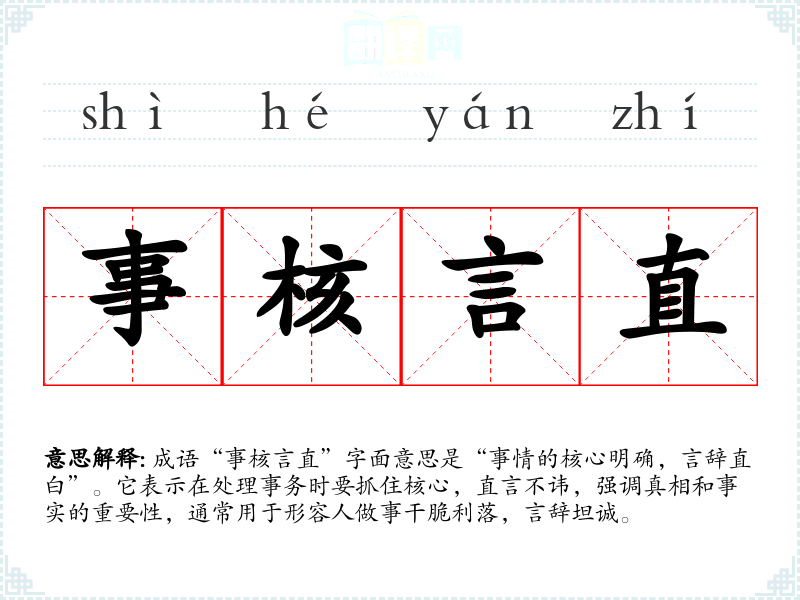 成语“事核言直”字面意思是“事情的核心明确,言辞直白”。它表示在处理事务时要抓住核心,直言不讳,强调真相和事实的重要性,通常用于形容人做事干脆利落,言辞坦诚。