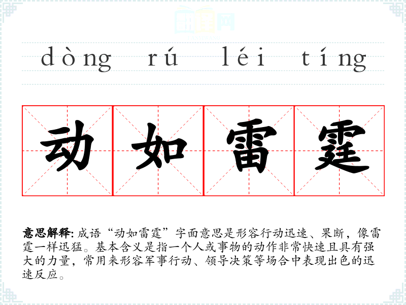 成语“动如雷霆”字面意思是形容行动迅速、果断,像雷霆一样迅猛。基本含义是指一个人或事物的动作非常快速且具有强大的力量,常用来形容军事行动、领导决策等场合中表现出色的迅速反应。