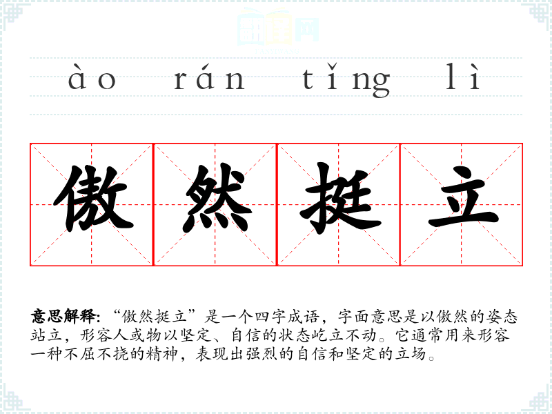 “傲然挺立”是一个四字成语,字面意思是以傲然的姿态站立,形容人或物以坚定、自信的状态屹立不动。它通常用来形容一种不屈不挠的精神,表现出强烈的自信和坚定的立场。