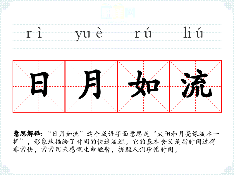 “日月如流”这个成语字面意思是“太阳和月亮像流水一样”,形象地描绘了时间的快速流逝。它的基本含义是指时间过得非常快,常常用来感慨生命短暂,提醒人们珍惜时间。
