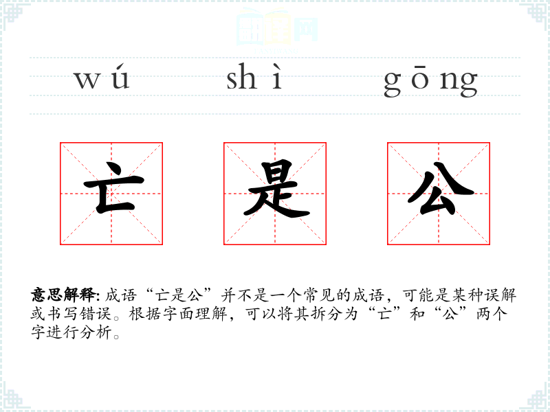 成语“亡是公”并不是一个常见的成语,可能是某种误解或书写错误。根据字面理解,可以将其拆分为“亡”和“公”两个字进行分析。