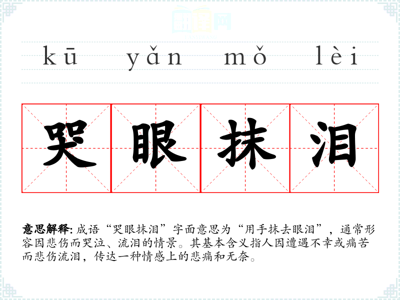 “哭眼抹泪”并没有明确的历史典故或文学出处,通常被视为一种对日常生活中悲伤情感的形象化表达。在古代诗词中,类似的意象常被用来描绘离别、思念或失落等情感,反映了人们对苦难的共鸣和感受。