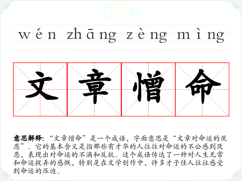 “文章憎命”是一个成语,字面意思是“文章对命运的厌恶”。它的基本含义是指那些有才华的人往往对命运的不公感到厌恶,表现出对命运的不满和反抗。这个成语传达了一种对人生无常和命运捉弄的感慨,特别是在文学创作中,许多才子佳人往往感受到命运的压迫。