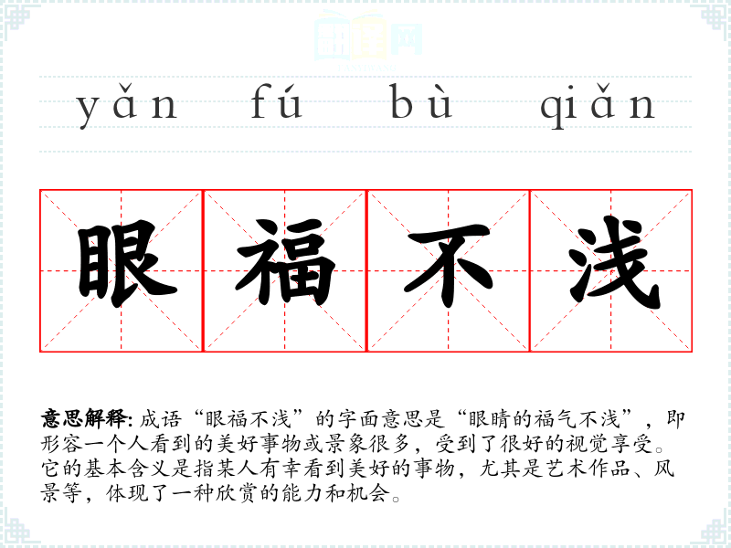 “眼福不浅”并没有具体的历史典故或文学出处,通常被认为是一种口语化的表达。它的构成可以追溯到传统文化中对“眼福”的重视,强调欣赏美的能力和机会。古代文人常常通过描写自然景色、艺术作品来表达自己的审美体验,因此“眼福”的观念在文学作品中得到了广泛体现。