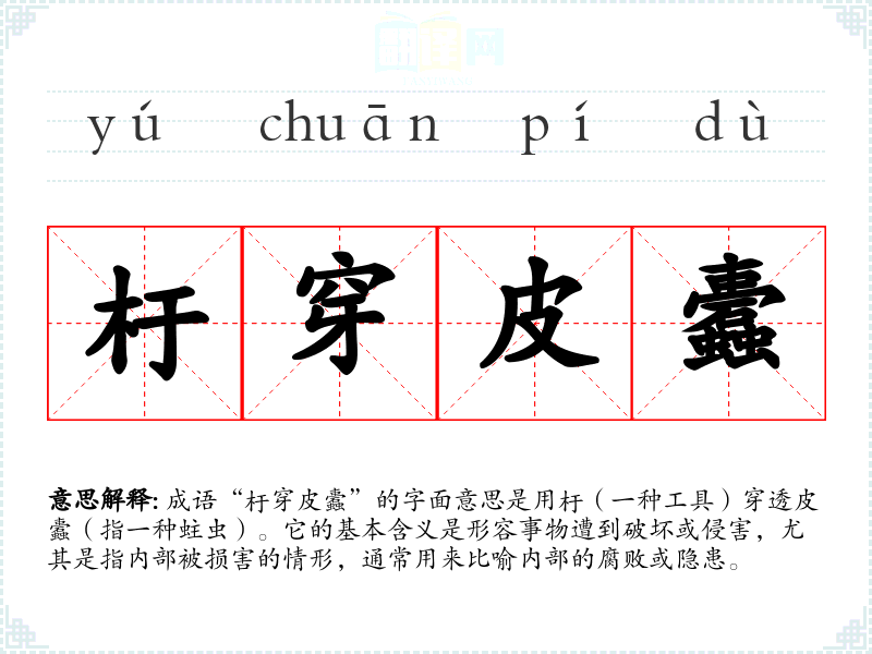 成语“杅穿皮蠹”的字面意思是用杅(一种工具)穿透皮蠹(指一种蛀虫)。它的基本含义是形容事物遭到破坏或侵害,尤其是指内部被损害的情形,通常用来比喻内部的腐败或隐患。