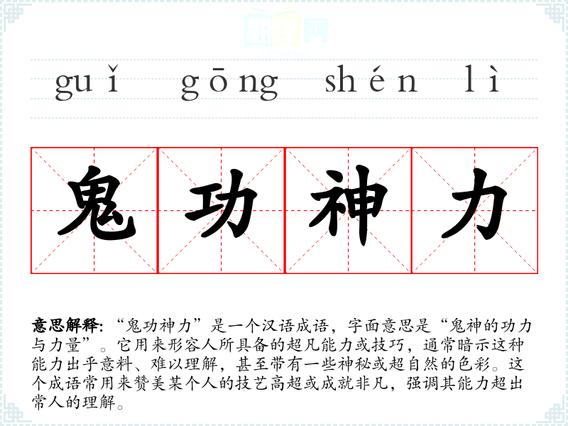 “鬼功神力”是一个汉语成语,字面意思是“鬼神的功力与力量”。它用来形容人所具备的超凡能力或技巧,通常暗示这种能力出乎意料、难以理解,甚至带有一些神秘或超自然的色彩。这个成语常用来赞美某个人的技艺高超或成就非凡,强调其能力超出常人的理解。