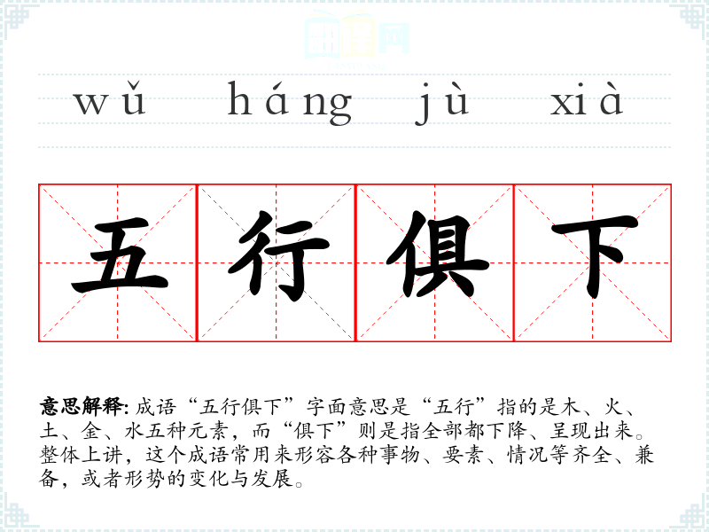 成语“五行俱下”字面意思是“五行”指的是木、火、土、金、水五种元素,而“俱下”则是指全部都下降、呈现出来。整体上讲,这个成语常用来形容各种事物、要素、情况等齐全、兼备,或者形势的变化与发展。