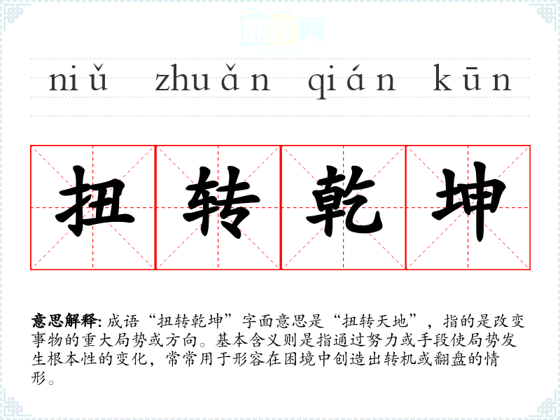 成语“扭转乾坤”字面意思是“扭转天地”,指的是改变事物的重大局势或方向。基本含义则是指通过努力或手段使局势发生根本性的变化,常常用于形容在困境中创造出转机或翻盘的情形。