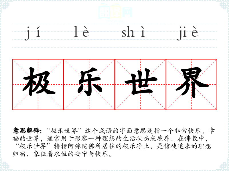 “极乐世界”这个成语的字面意思是指一个非常快乐、幸福的世界,通常用于形容一种理想的生活状态或境界。在**中,“极乐世界”特指阿弥陀佛所居住的极乐净土,是信徒追求的理想归宿,象征着永恒的安宁与快乐。