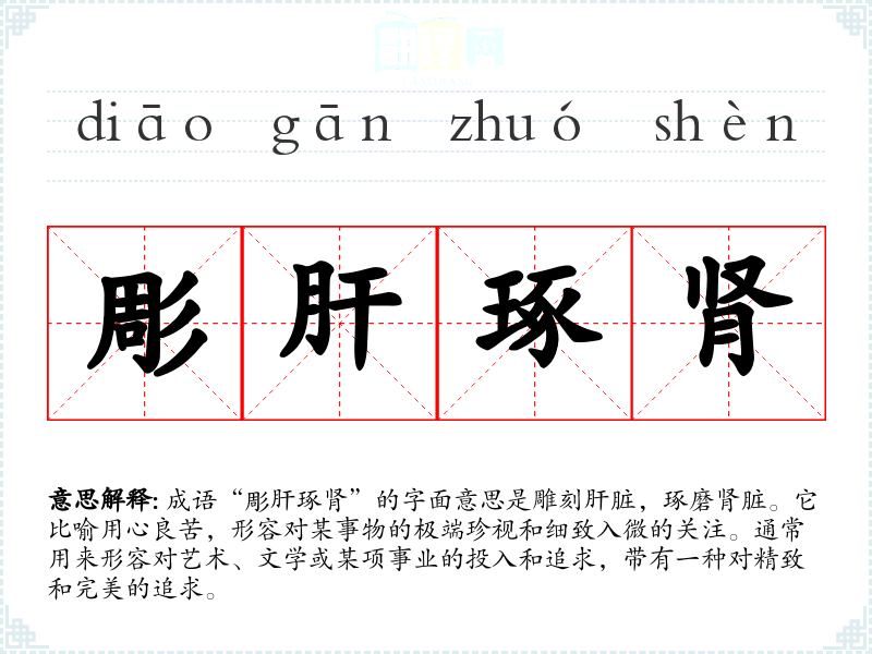 成语“彫肝琢肾”的字面意思是雕刻肝脏,琢磨肾脏。它比喻用心良苦,形容对某事物的极端珍视和细致入微的关注。通常用来形容对艺术、文学或某项事业的投入和追求,带有一种对精致和完美的追求。