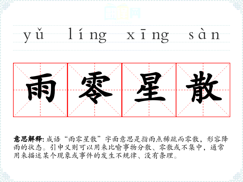 “雨零星散”并没有明确的历史典故或文学出处,但其构成的词汇在古典诗词和文学中常被用来描绘自然景象。在古人描写天气和景物时,往往会用“零星”这样的词汇来形容小雨的状态,从而引申出其比喻意义。