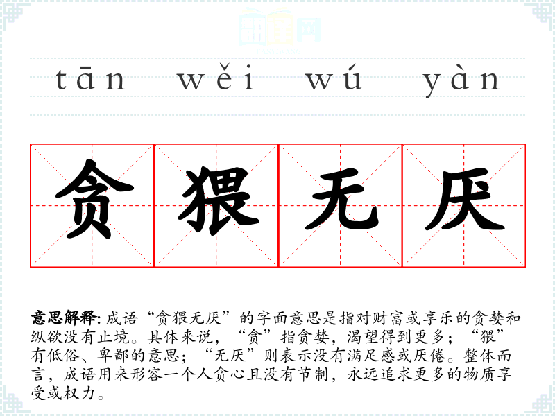 成语“贪猥无厌”的字面意思是指对财富或享乐的贪婪和纵欲没有止境。具体来说,“贪”指贪婪,渴望得到更多;“猥”有低俗、卑鄙的意思;“无厌”则表示没有满足感或厌倦。整体而言,成语用来形容一个人贪心且没有节制,永远追求更多的物质享受或权力。