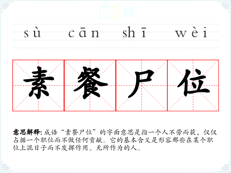 | 尸位素餐 | 尸位:空占职位,不尽职守;素餐:白吃饭。空占着职位而不做事,白吃饭。 |