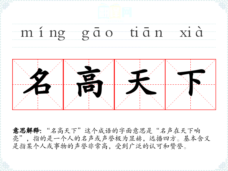 “名高天下”没有确切的历史典故出处,但其构成词汇中的“名”指的是声誉、名声,而“天下”则代表整个世界或社会。通过这两个词的结合,可以推测出其意图强调一个人在社会中的显赫地位和广泛的影响力。