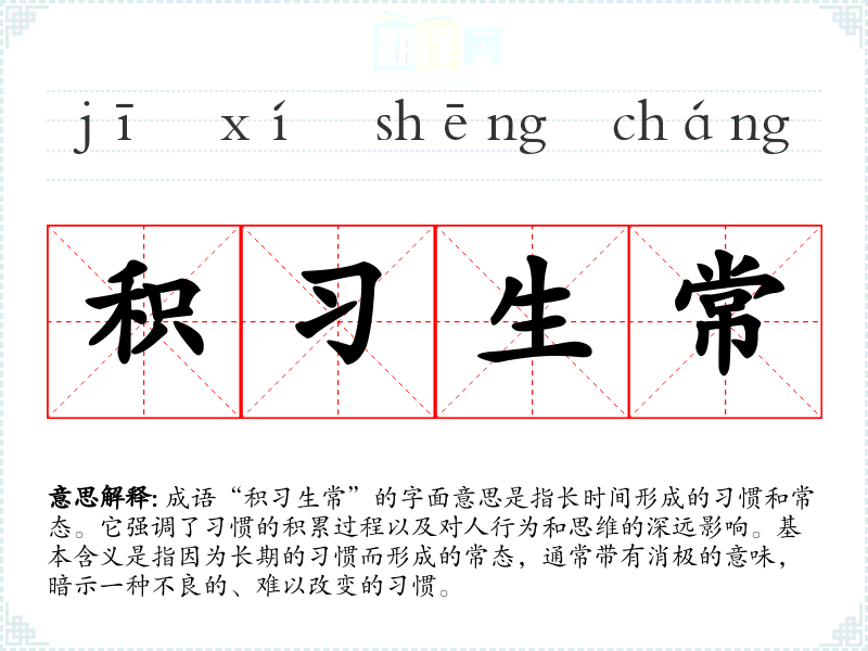 成语“积生常”的字面意思是指长时间形成的惯和常态。它强调了惯的积累过程以及对人行为和思维的深远影响。基本含义是指因为长期的惯而形成的常态,通常带有消极的意味,暗示一种不良的、难以改变的*惯。