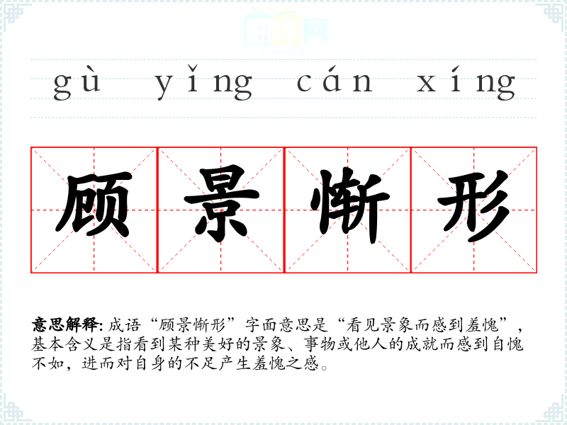 成语“顾景惭形”字面意思是“看见景象而感到羞愧”,基本含义是指看到某种美好的景象、事物或他人的成就而感到自愧不如,进而对自身的不足产生羞愧之感。
